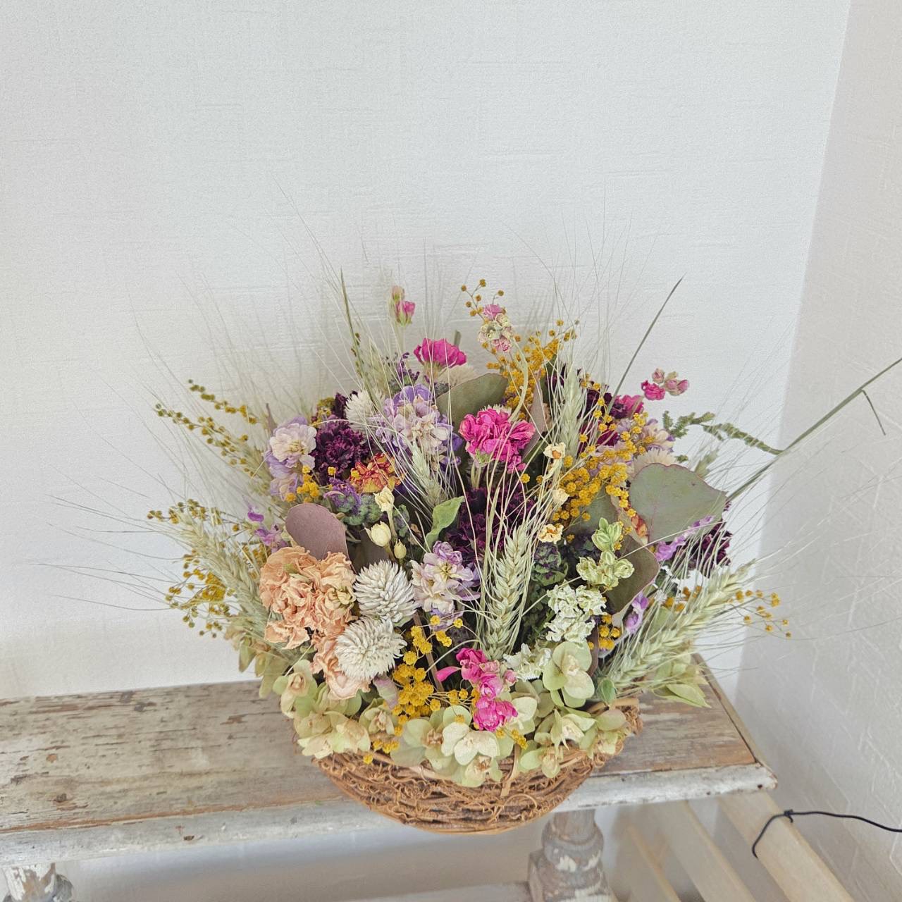 色とりどりの春のお花を集めて、かごにアレンジしていきます。
