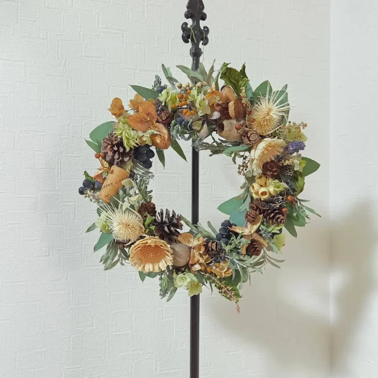 秋色のお花と木の実を使ってリースにし、ハロウィーンのリボンを付けます。